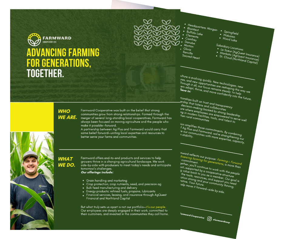 Our member-owners deserve clarity, transparency, and certainty. This page is your home base for everything related to the proposed unification between Ag Plus Cooperative and Farmward Cooperative.